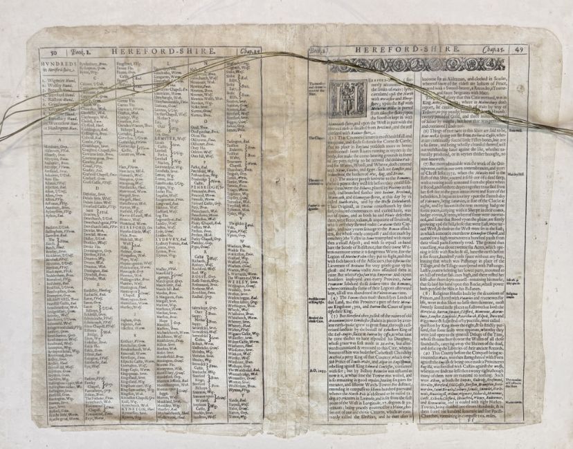 John Speede - a 17th century hand coloured map of Herefordshire. Framed and glazed. Accompanied by a Samuel & Nathaniel Buck engraving 'The South East View of Brompton Brian Castle in the County of Hereford'. Framed.