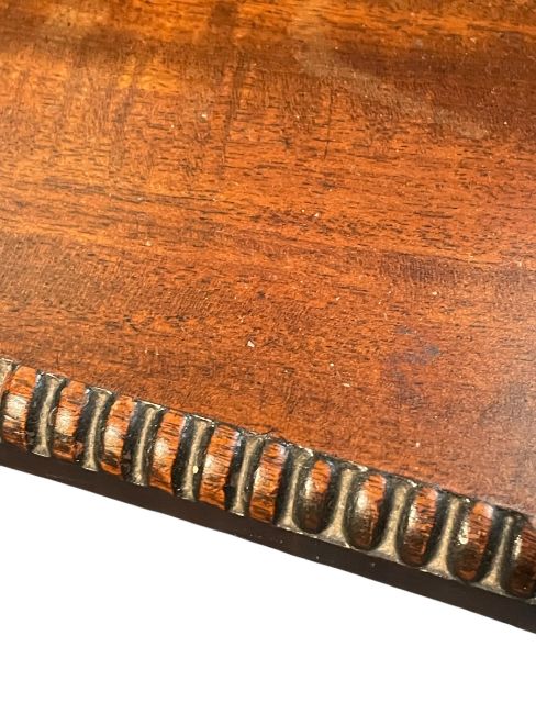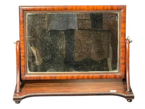 A 19th century Regency mahogany dressing table swing mirror. The original mirror plate set within an ebony and mahogany cushioned frame supported by two sweeping A-framed supports. All raised on a shaped base with beading to the edges and bun feet.