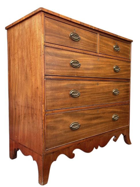 A George III 19th century mahogany two over three chest of drawers. The chest having a straight rectangular top over a two-over-three drawer configuration. Rach with brass escutcheons and swing handles. All raised on bracket feet and shaped apron.
