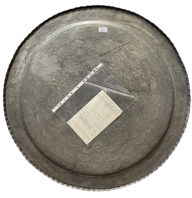 A large Turkish early to mid 20th century hand embossed brass & copper wall charger/table top. The charger having Arabic inscriptions throughout the rim. Centre decorated with intricate floral motifs in the shape of a mandala.