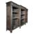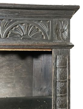 A large Jacobean Revival 19th century carved ebonised oak breakfront open front bookcase. The bookcase having a carved chamfered edge top over a carved fitted frieze below with foliate palmette motifs. The shelved sections below with some leather tooled fringes still present. All raised on straight squared feet.