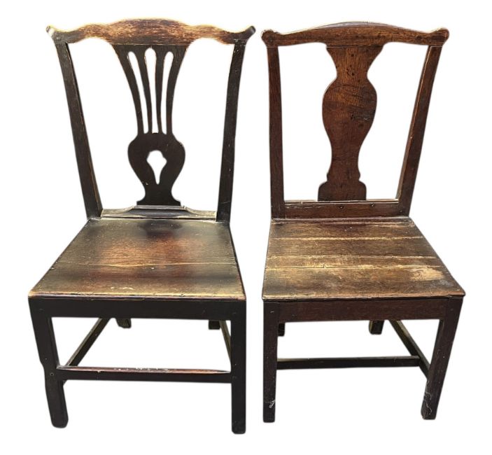 A harlequin set of four George III late18th/early 19th century oak wood dining chairs. The lot to include a pair with lyra shaped back splat on a straight seat and straight squared supports. Together with two slightly different back splats chairs.