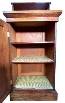 A 19th century Victorian mahogany chiffonier of slender sentry form. The arched-shaped back with a raised shelf supported by turned uprights. Single panel fronted door below, with all being raised on a plinth base.
