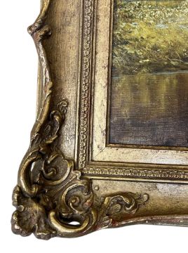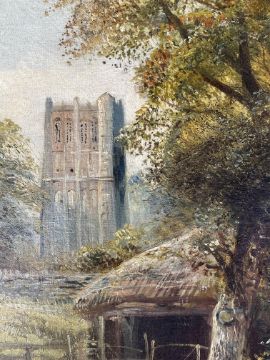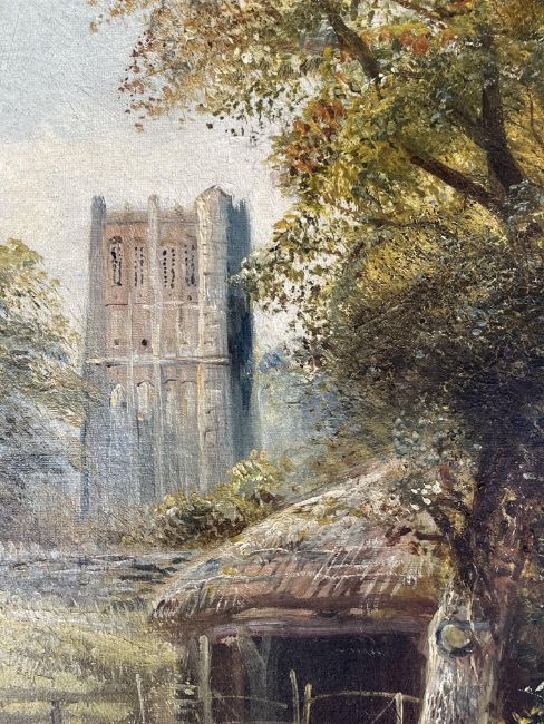William Vivian Tippett (British, 1833-1910) - On the Frome, near Bristol - a late 19th century circa 1897 oil on canvas landscape painting. The painting depicting a herd of cows by river with stone bridge in the background. Cathedral tower in the background within trees. Signed and dated lower right. Framed.
