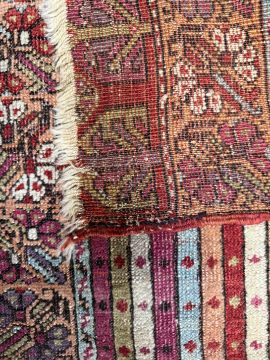 An early 20th century Turkish Anatolian Yastik woollen hand woven natural dye carpet rug. The rug having a central panel with a polychrome horizontal pattern, all enclosed within a floral outer border with tassels to ends. Measures approx. 81cm x 51cm.