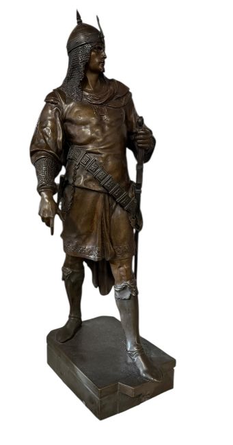 Emile Louis Picault (French, 1833-1915) - a large French late 19th century patinated bronze figure of a Saracen warrior. The patinated bronze study depicting the warrior in full armour and helmet, with sword and dagger to sides. Being raised on plinth base signed E. Picault.