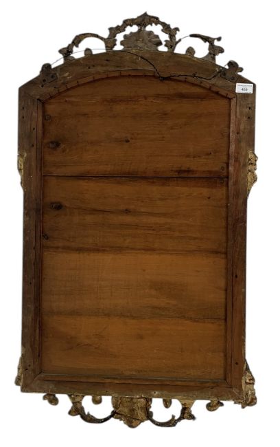 A French Louis XV inspired 19th century giltwood and gesso wall mirror. The mirror having an intricately carved seashell and scrolled acanthus leaves pediment atop. Bow-topped frame with relief braided details. Central mirror plate.