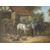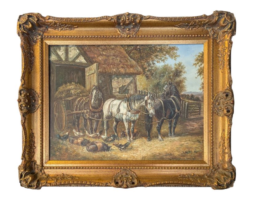 After John Frederick Herring Jr. (1815-1907) - an early 20th century oil on canvas genre painting after the original 'The Hay Cart'. the paintign depicting horses, pigs and chickens by stable with a hay cart in the background. Unsigned. Framed.