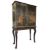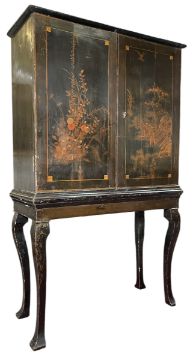 A Chinese 18th century lacquered chinoiserie cabinet on stand. The cupboard having a flared straight top over twin cupboard doors decorated with a floral bouquet and Chinese landscape with a pagoda. All raised on cabriole legs base.