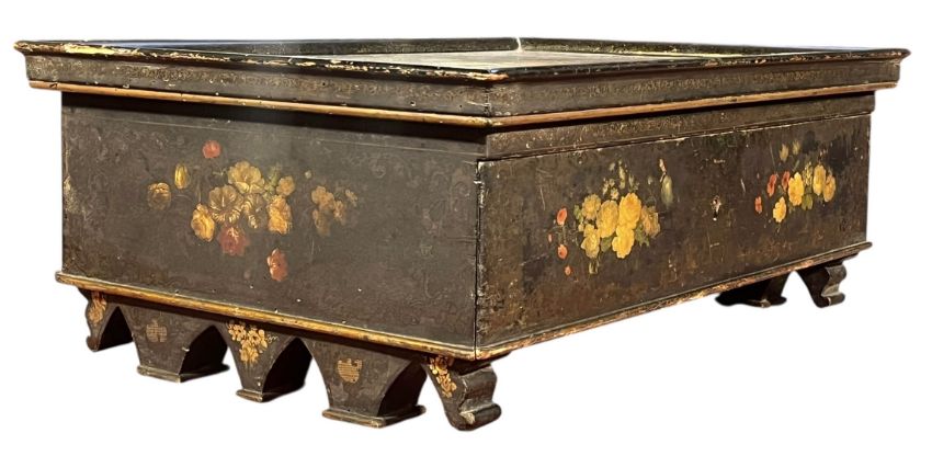 A French 19th century hand painted lacquered wooden toleware table chest/box. The chest having a recessed hand-painted top with a bouquet of flowers to centre. Single full length drawer below withmatching motifs. Painted sides and all raised on shaped arched feet with further gilt decorations.