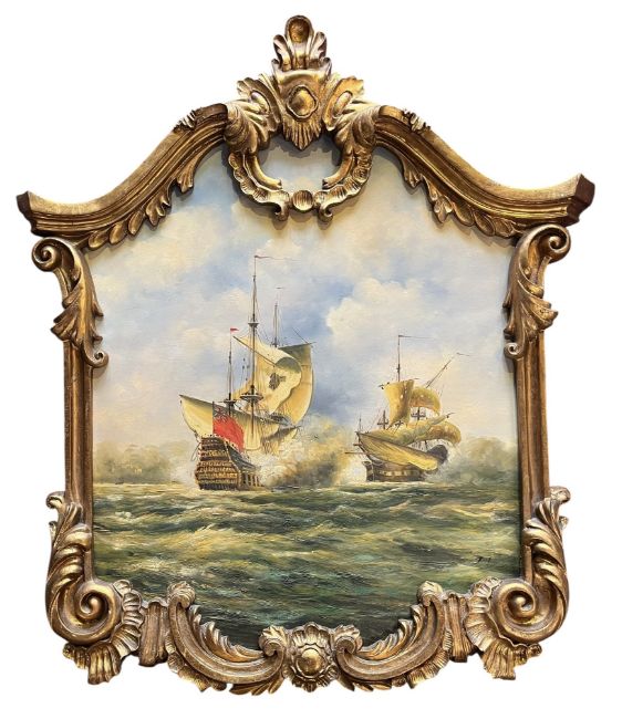 20th Century English School - an oil on canvas laid on board maritime painting depicting possibly the HMS Expedition during Wager's Action off Cartagena. The painting depicting the galleon against another ship with smoke and rough seas. Signed R T to lower right. Framed in giltwood carved ornate frame.