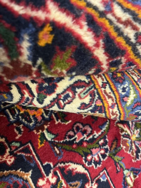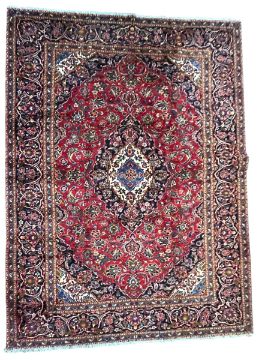 A large early 20th century Central Persian Kashan hand-woven wool floor carpet rug. The carpet having a central medallion in dark blue, white and red intricately decorated with floral motifs. Series of outer borders with further floral and foliate decorations. Short tassels to ends.
