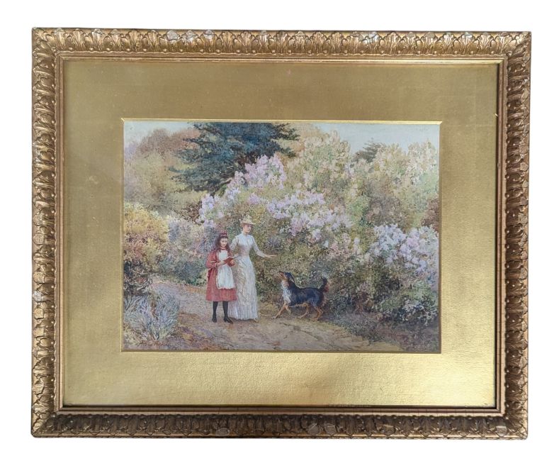 Arthur Hopkins (British 1848-1930) - 'A Strol... in Time' - a watercolour and gouache heightened landscape painting. The painting depicting an afternoon stroll between mother, daughter and dog, with blooming bushes in the background. Signed lower left. Label to back tared off but some present. Mounted, framed & glazed.