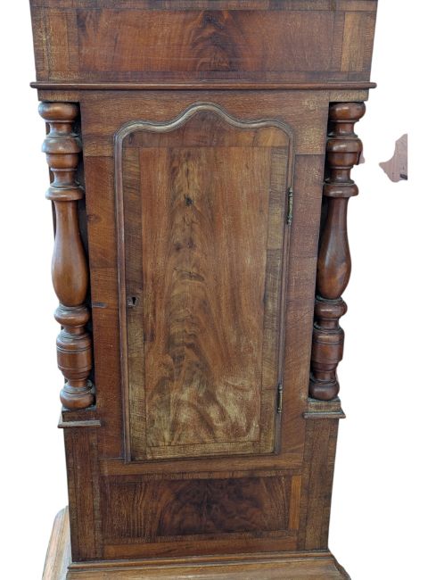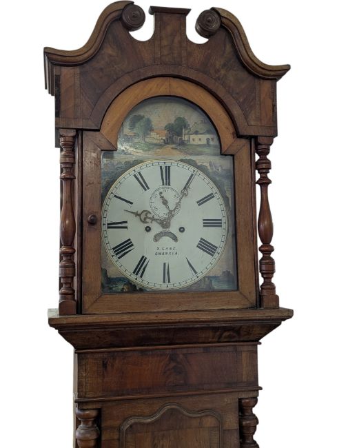 Ganz, Swansea - a Victorian mid 19th century flame mahogany cased 8-day longcase grandfather clock. The clock having a swan neck pediment atop with glazed front hood and tuned columns to sides. Matching carved columns to the case, all raised on bracket feet. The clock face havign a painted lozenge with countryside cottages and landscape, Roman numerals to chapter ring with subsidiary face.