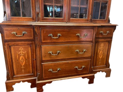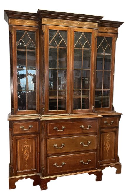 An Edwardian early 20th century circa 1900s mahogany inlaid breakfront library bookcase. The bookcase having inlaid fitted frieze over astragal glazed cabinet doors. The base with central bank of three drawers flanked by inlaid cupboard doors and single drawers atop. All raised on bracket feet. Righ front and back feet loose by present and undameged.