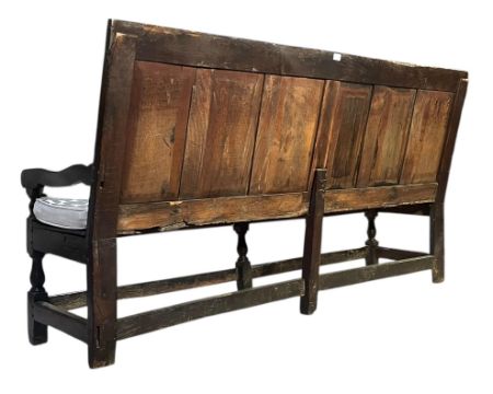 A late 17th century carved oak settle / bench. The settle having six-panel carved backrest with a carved frame dated 1689, each panel decorated with stylised foliate motifs. Flanked armrests with a panelled seat, all raised on block and turned supports united by stretchers. Stamped WS to one leg.
