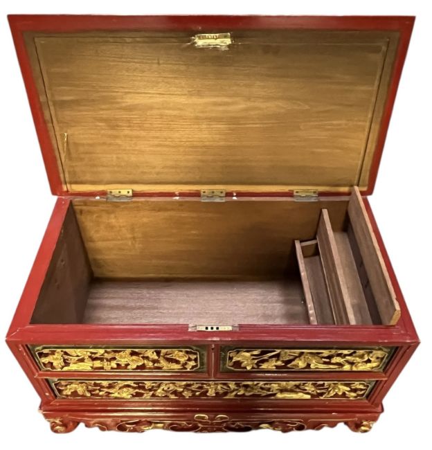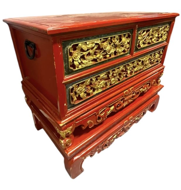 A Javanese Peranakan/Straits inspired red lacquered and gilt painted wooden wedding chest with offering table. The chest having a straight top over an intricately carved panelled front with floral and foliate gilded details, all raised on carved base. The hinged top opening to reveal a spacious interior with drawers and a compartment to one side. Together with a matching offering/low occasional table.