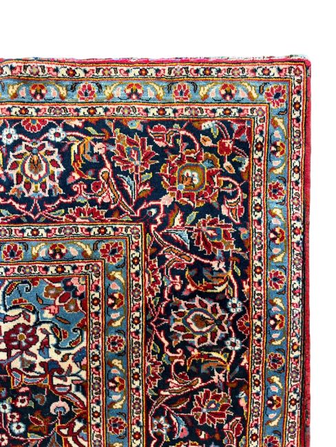 A vintage 20th century Persian Islamic Keshan hand knotted 100% wool pile, cotton warp, 250,000/m2 knot density floor carpet rug. The carpet having a central floral medallion in blue, cream and green set within a red ground central panel. All decorated with intricately woven floral & foliate motifs. Series of graduating outer borders and short tassels to ends. Label to back from Nain Trading.