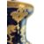 A pair of Sevres-inspired cobalt blue and gilt ceramic table lamp bases. Each having a baluster-shaped body decorated with scrolled gilt foliate motifs on a cobalt blue ground. Each raised on a wooden plinth base. Sold as untested.
