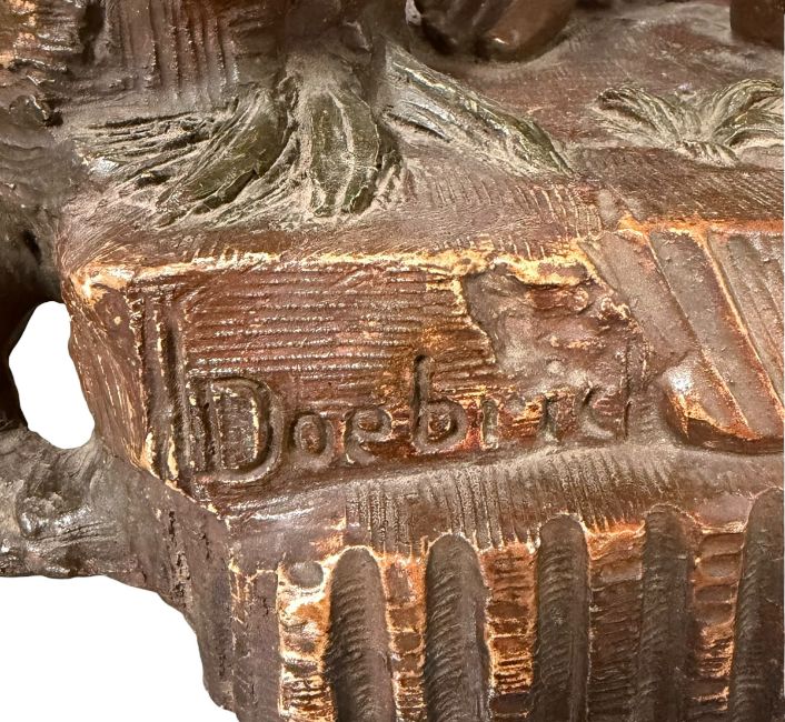 Doebrich (Austrian, 19th century) - a large Austrian circa 1900 Art Nouveau cold painted terracotta female sculpture of a North African street seller. The study modelled as a North African woman, partially nude with basket. Raised on a naturalistic plinth base and signed Doebrich. Signed to underside.