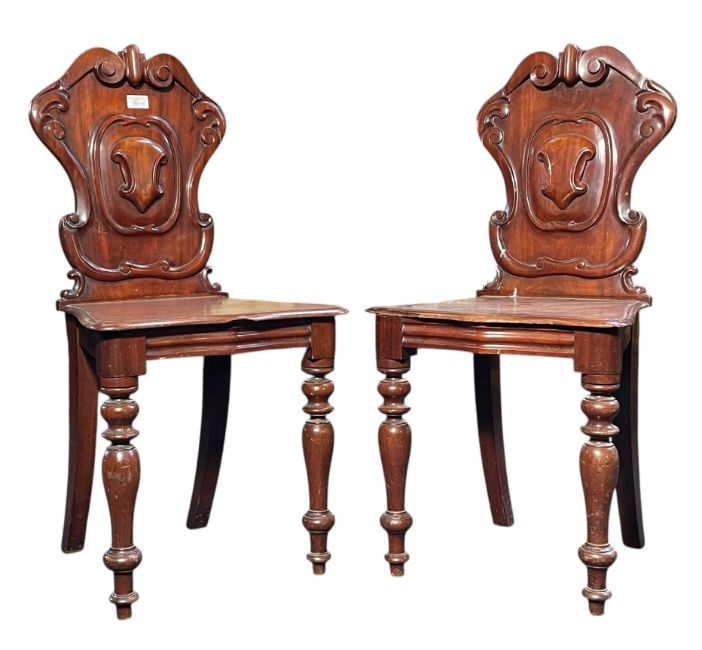 A pair of Victorian 19th century mahogany crested hall side chairs. Each having a carved backrest with scrolled foliate designs and a central relief crest. Shaped seats, all raised on turned tapering front legs and splayed squared back legs.