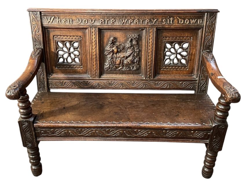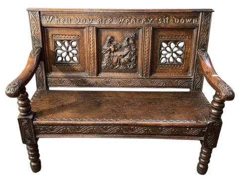 A 19th century carved oak Monk's bench / settle. Heavily carved throughout with the backrest having three panels and notation above reading 'When you are Wearey Sit Down'. Carved armrests flanking the seat with all supported by turned and carved legs.