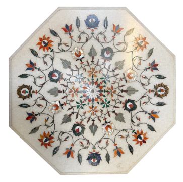 An early 20th century Indian pietra dura micromosaic marble and semi-precious stones octagonal table top. The top decorated with scrolled foliate and floral motifs in various colours and stones.