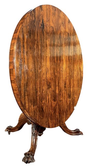 A 19th century William IV rosewood circular tilt top breakfast loo table. The top of circular form with butterfly rosewood veneer over a fitted frieze. The table raised on three carved, large lions' hairy paw feet on a trefoil with a turned carved central column support. All upon lignum vitae castors.