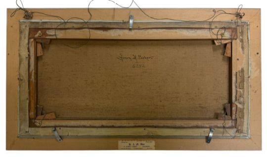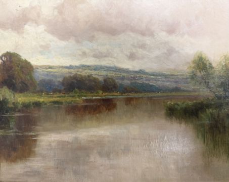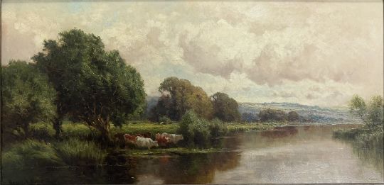 Henry H. Parker (1858 - 1930) - A 19th century oil on canvas landscape painting with cattle. The painting depicting cattle drinking by riverbank. Hills in the background. Signed lower left. Framed.