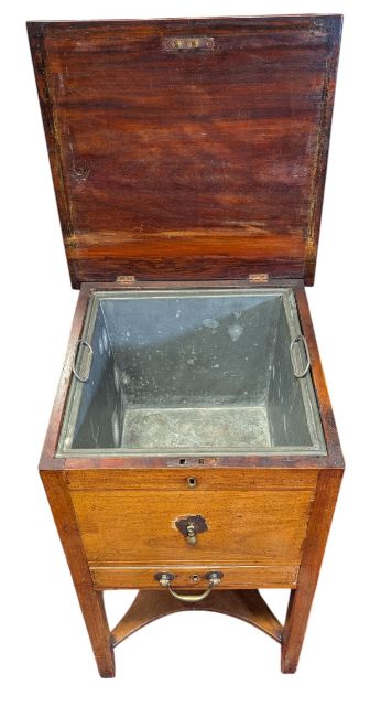 A 19th century George III mahogany wine cooler. The cooler having a squared hinged top opening to reveal a lined wine cooler interior. Brass carry handles to sides and a droplet handle to front. Single drawer below, all raised on squared straight supports. All united by shaped undertier.