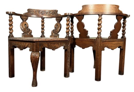 A pair of 19th century Victorian carved oak corner chairs. Each chair having plain oak panel seats raised on squared legs. Each with Maltese dolphins carved to the back splats, interspersed with barley twist supports.