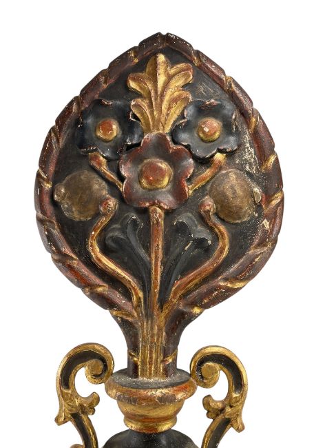 A pair of Continental, possibly French 19th century giltwood and gesso mantle ornamental pieces/appliques. Each of fan shape with a carved panel atop depicting floral motifs. Raised on twin handled urn vases and plith bases.