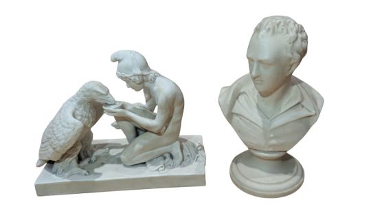 Collection of 19th & 20th century porcelain and ironstone decorative pieces. Comprising Copenhagen Eneret Parianware figure of a man feeding an eagle, a Belleek china basket, an ironstone plate decorated with a crest and motto 'Virtute Duce', a porcelain neo-classical decorated trinket pot, two Staffordshire earthenware figures, and more. Largest piece measuring approx. 24cm tall. Sold as seen.