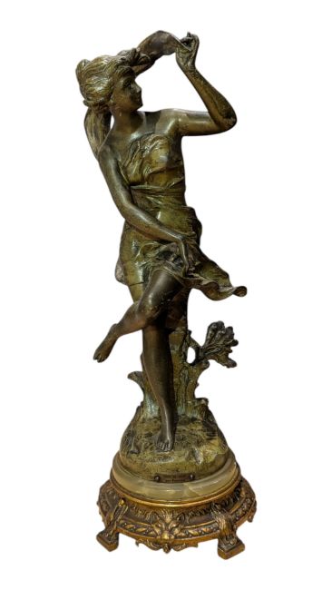 After Ernest Justin Ferrand - Coup de Soleil - A pair of early 20th century French Art Nouveau spelter garniture cold painted figurines. Modelled to depict two nymphs in classical dress in summer breeze. Stamped for France. Measuring approx. 36cm tall.