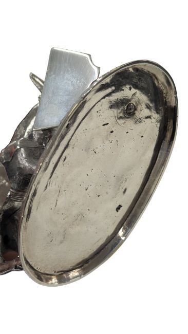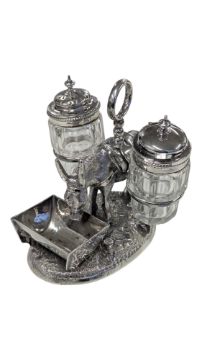 A Victorian 19th century donkey cruet / condiment set. Having a donkey figure to the middle with two holders containing cut glass with silver plate sifter and lidded pot. On a naturalist base with donkey feed trough.