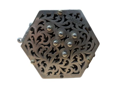 C. Wheatstone & Co - Early 20th century miniature concertina squeeze box. Featuring pierced nickel plated octagonal end caps with twelve buttons and leather body. Serial number 31033 and marked for Wheatstone. Measuring approx. 12cm x 8cm x 8cm.