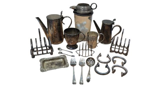 Collection of 19th and 20th century silver plated pieces. To include toast racks, chocolate pots, forks, spoons, cups, and more. Featuring makers such as Olivant and Botsford, Asprey, William Suckling & Sons, and more. Largest piece measuring approx. 18.5cm tall.