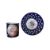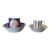 18th century Sevres style coffee cups & saucers. Comprising a Bavarian cobalt blue design example with a courting couple portrait to the center of the cup, and a red, blue and gilt geometric patterned coffee cup and saucer. Both marked to the bases. Sold as seen. Largest cup measuring approx. 7.5cm in height.
