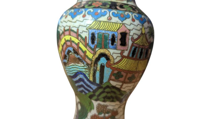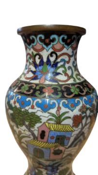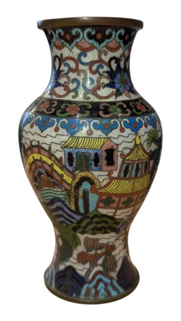 19th century Chinese Qing Dynasty small cloisonné enamel vase. Of baluster form and decorated with a folk design of traditional houses, trees, bridges and foliate motifs in a polychrome colourway. Sold as seen. Measuring approx. 15cm tall.