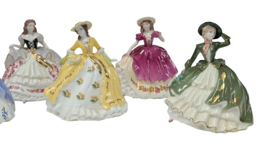 Coalport - Fairest Flowers - A set of late 20th century porcelain china lady figurines. Jack Glynn sculptor signed by Kneale H Ashwell Rinalda Ward managing director of Comptom & Woodhouse. Including Poppy, Pansy, May, Primrose, Iris, Holly, Rose and Lily.
