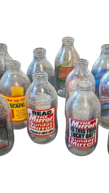 A colection of vintage 20th century glass milk bottles. The collection to include baring various colour slogans and visuals. Featuring examples branded with Kelloggs, Typhoo, The Mirror, and Cadbury's amongst others.