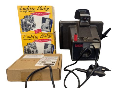 Collection of late 20th / 21st century cameras and accessories. Comprising a 2009 Lumix DMC GF1 digital camera with blue canvas bag, a 1990s Praktica AP3 10 35mm point and shoot camera with soft carry case, a Super Swinger Polaroid Land Camera, two Empire Baby Wonder Cameras, and batteries / chargers.