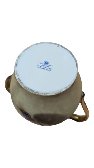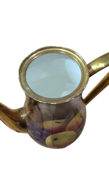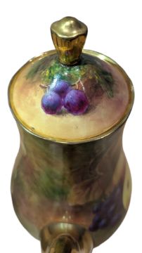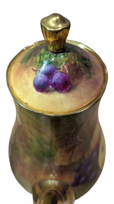 Late 20th century fine bone china Richard Budd coffee pot / teapot. Decorated with a transfer design of fruit and gilt painted spout, handle and lid finial. Marked to the base. Measuring approx. 26cm tall.