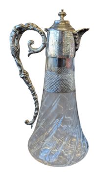 Late 19th / early 20th century Art Nouveau cut glass claret jug. Featuring silvered metal mounts with engraved foliate design and figural moulded handle. Glass jug with twisted and cut design. Measuring approx. 27.5cm tall.
