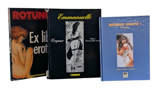 A collection of three vintage 20th century adult eroctic nude animation comic hardback books. French Examples includig Morbus Gravis I Druuna - Paolo Eleuteri Serpieri, Rotundo Ex Libris Eroticis l'Écho des Savanes / Albin Michel and Emmanuelle Crepax d'après Emmanuelle Arsan - Dargaud.