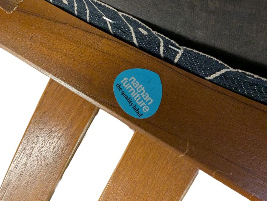 Nathan Furniture - A vintage mid 20th century teak dining table & chairs. The table of rectangular form with folding integrated leaf on tapering supports. Together with four dining chairs with railed back rest over later floral upholsterey pad seats. All raised on tapering legs.