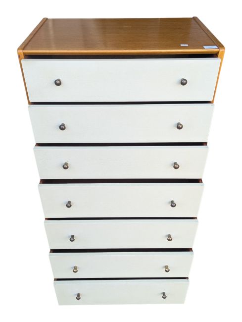 Ernest Gomme for G-Plan Furniture - A vintage mid 20th century E. Gomme G-Plan ' China White ' tall boy chest of drawers. Having seven graduated drawers being raised on ebonised supports with brass caps.
