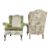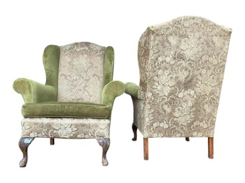 A Pair of Queen Anne wingback mahogany armchairs. The chairs having two tone green and floral fabric upholstery with scrolled elbow rests. With drop in cushioned seat. All raised on carved cabriole legs.