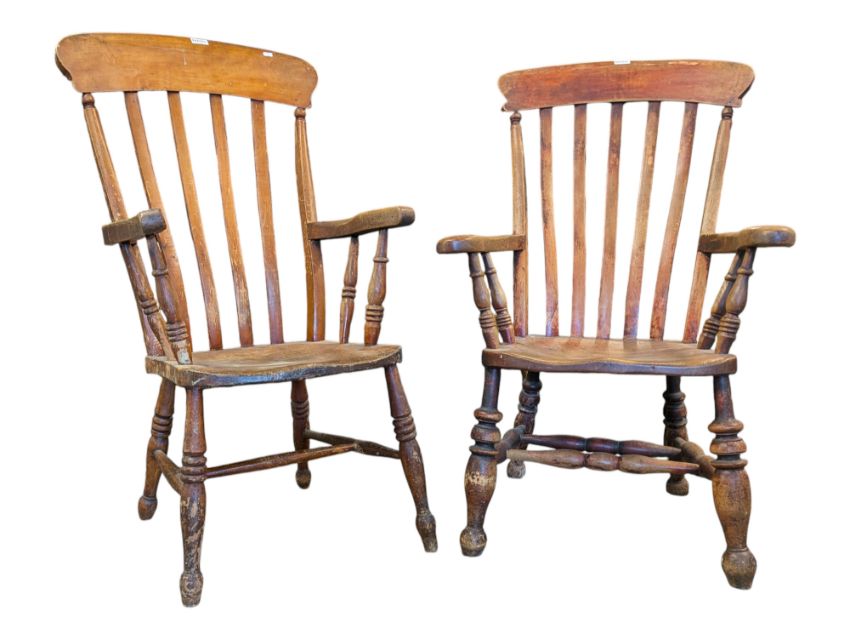 Two 19th century Victorian Windsor beech and elm armchairs. The chairs having shaped top rail over lathe back rests and shaped armrests on a saddle seat. Upheld on turned supports united by stretcher.