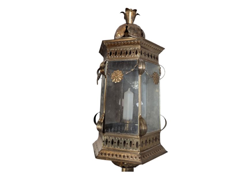 A 19th century French brass wall lantern of classical form with glass panels hexagonal form having turned wooden column with embossed brass wall mount.